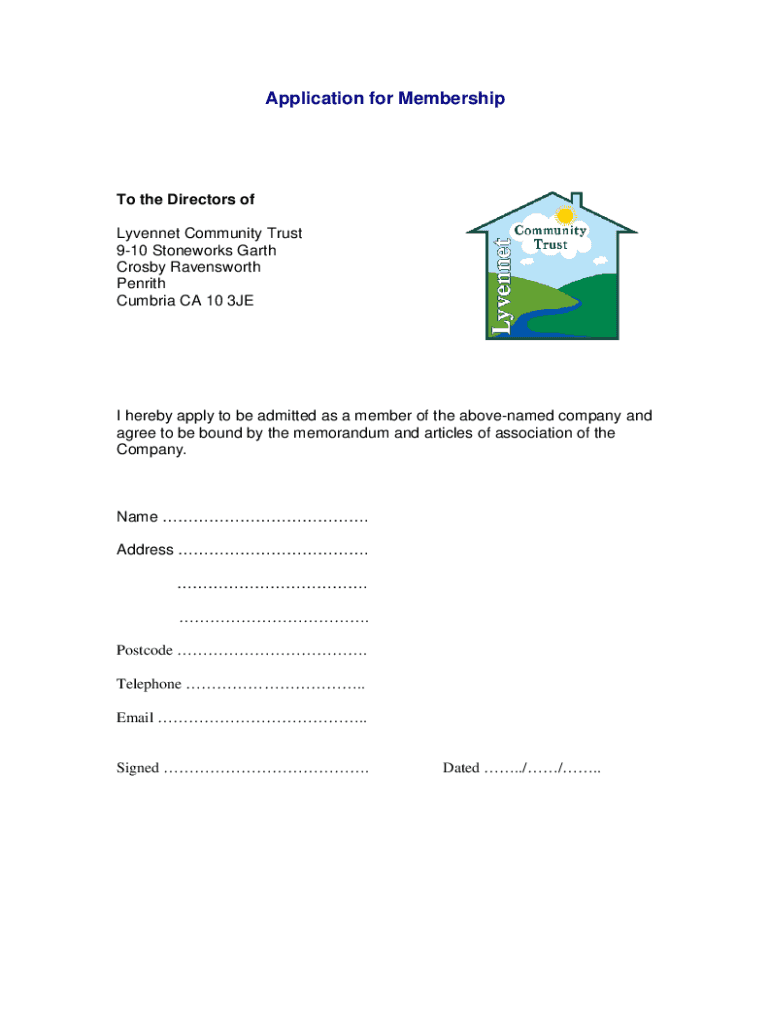 Application for Membership the Directors of Lynne Community Trust 910 Stonework Garth Crosby Ravensworth Perth Cambria CA 10 3JEI hereby apply to be admitted as a member of the above named company