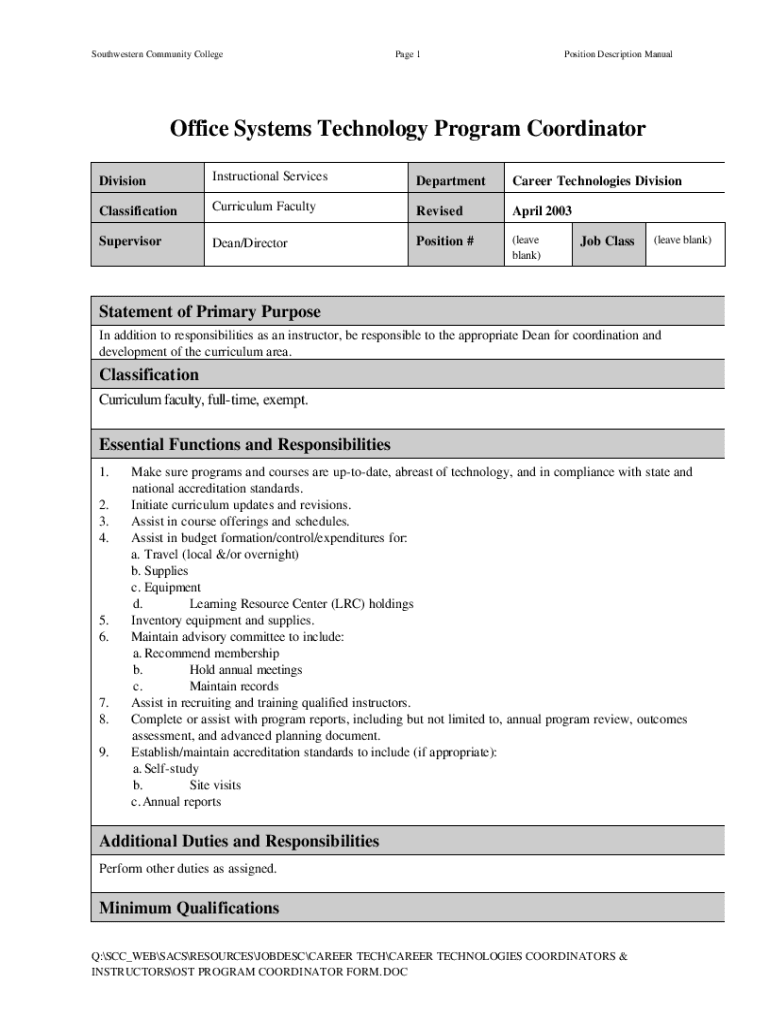 Southwestern Community College Page 1Position Description ManualOffice Systems Technology Program Coordinator