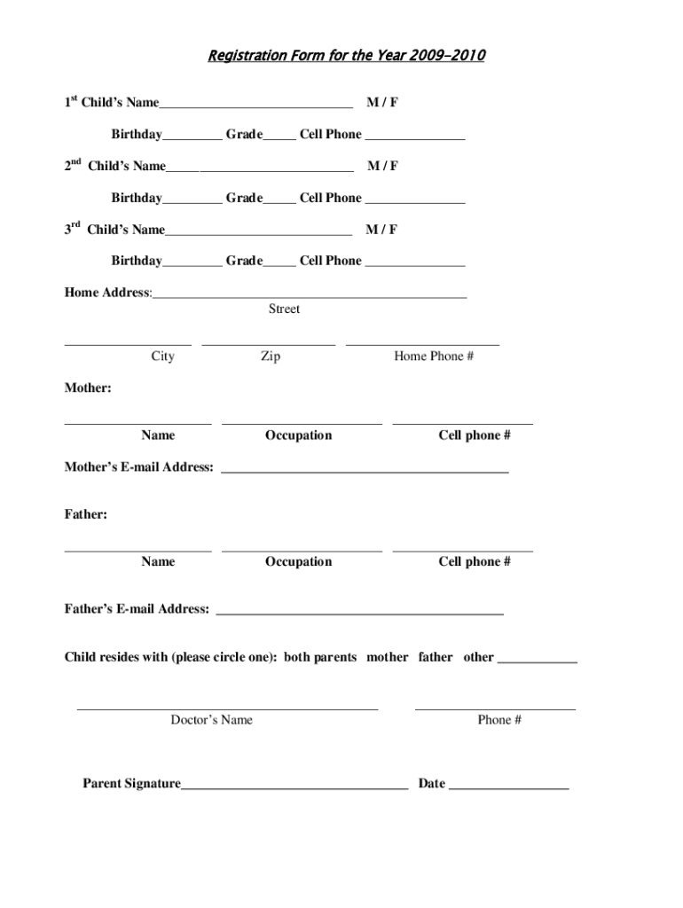 Registration Form for the Year 20092010 1st Child's Name M/Birthday Grade Cell Phone 2nd Child's Name M/Birthday Grade Cell Phone 3rd Child's Name M/Birthday Grade Cell Phone Home Address: Street