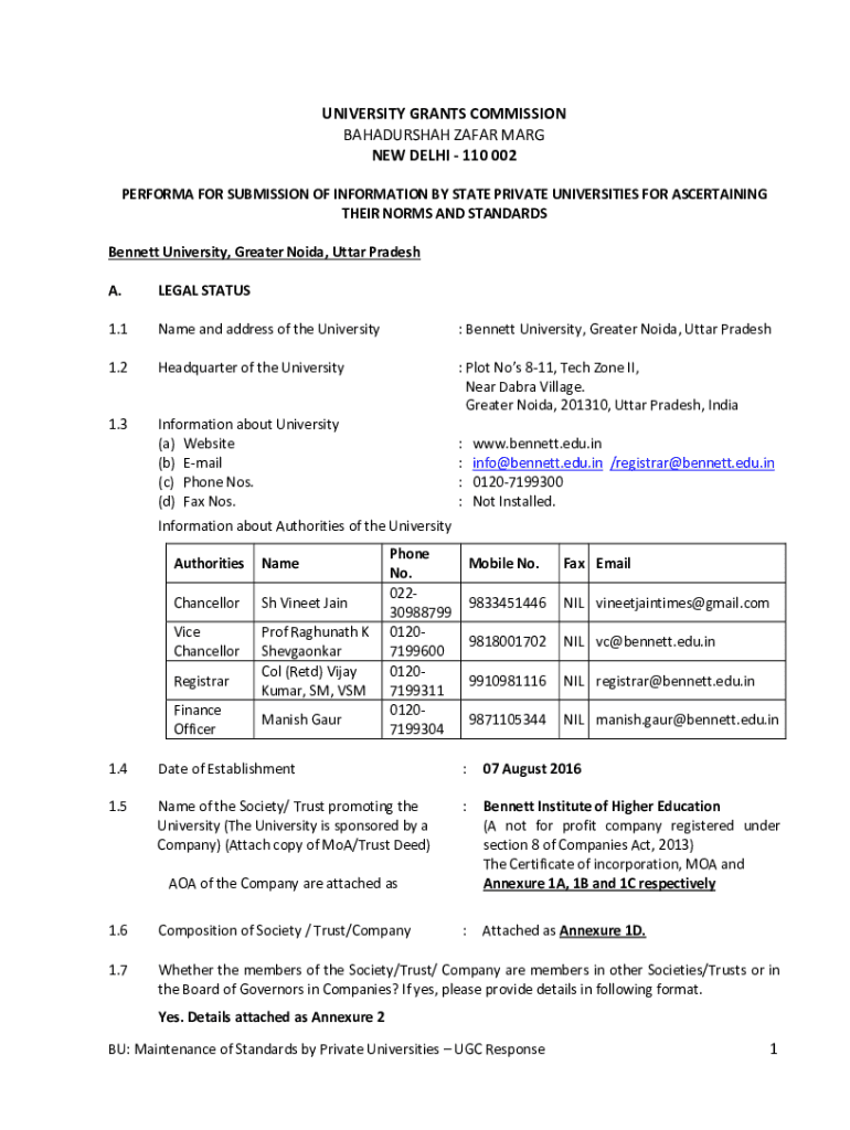 UNIVERSITY GRANTS COMMISSION BAHADURSHAH AFAR MARY NEW DELHI 110 002 PERFORM FOR SUBMISSION OF INFORMATION BY STATE PRIVATE UNIVERSITIES FOR ASCERTAINING THEIR NORMS AND STANDARDS Bennett University,