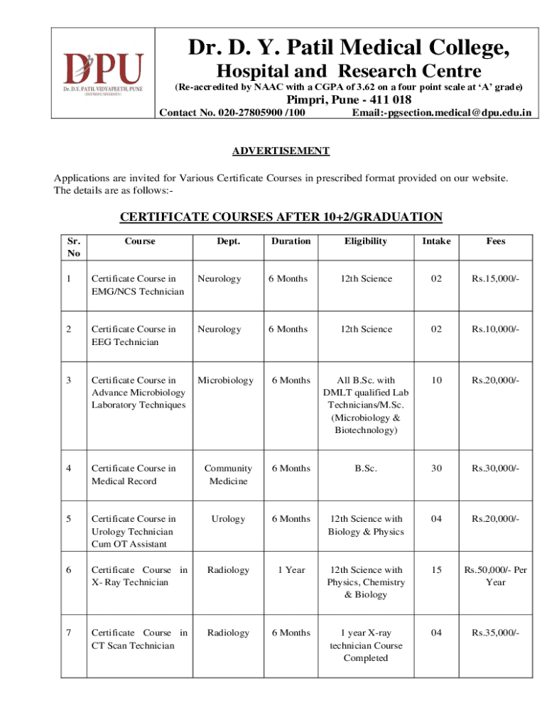 Dr. D. Y. Patel Medical College, Hospital and Research Center (Re accredited by NAACP with a CGPA of 3.62 on a four point scale at A grade)Pimps, Pune 411 018 Contact No. 02027805900 /100Email:pg