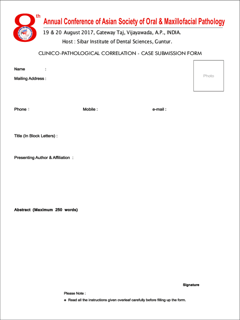 8Annual Conference of Asian Society of Oral & Maxillofacial Pathology 19 & 20 August 2017, Gateway TAJ, Vijayawada, A.P., INDIA. Host : Sitar Institute of Dental Sciences, Guntur. CLINICOPATHOLOGICAL