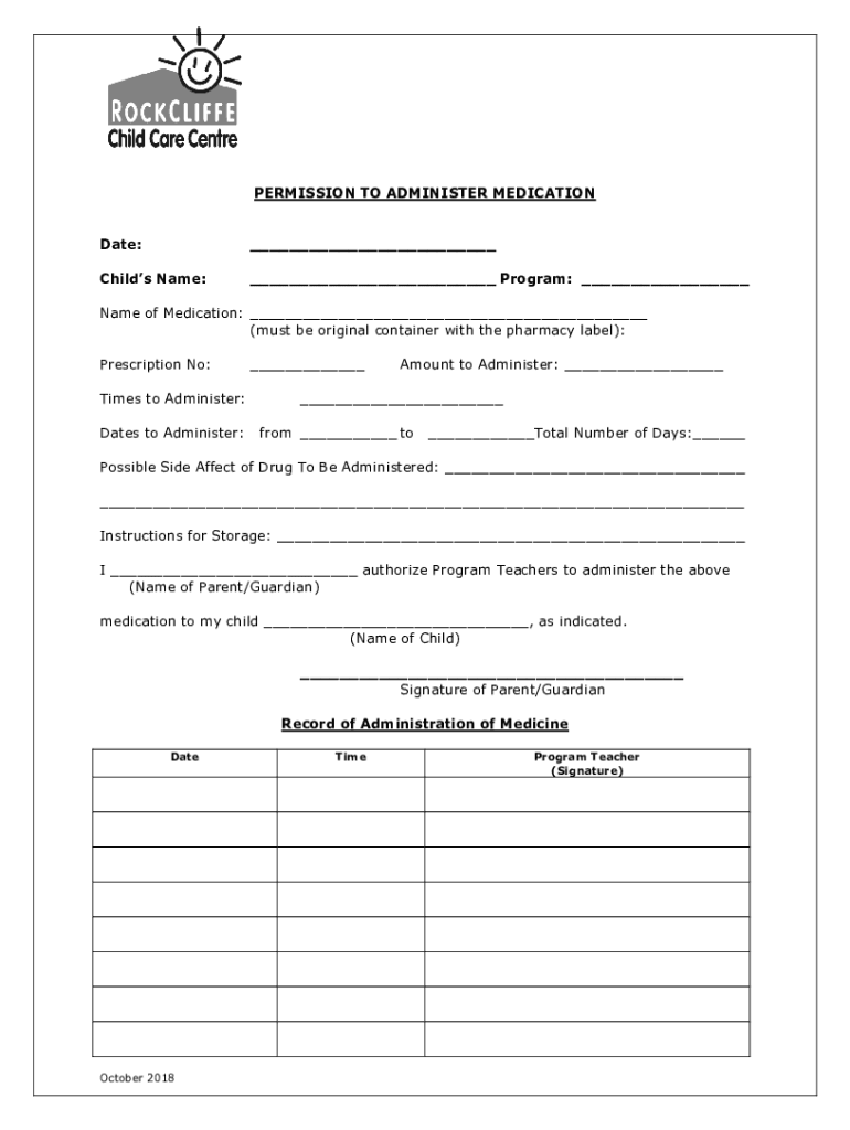 PERMISSION TO ADMINISTER MEDICATION Date: Child's Name: Program: Name of Medication: (must be original container with the pharmacy label): Prescription No: Times to Administer: Dates to Administer: