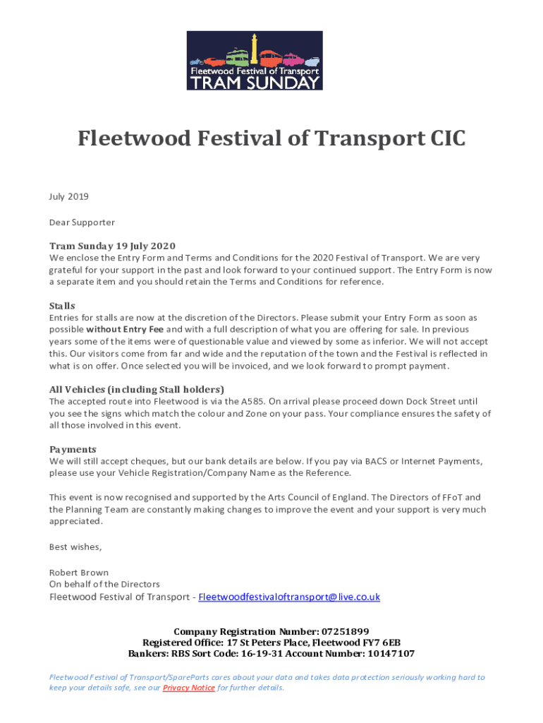 We enclose the Entry Form and Terms and Conditions for the 2020 Festival of Transport. We are very
