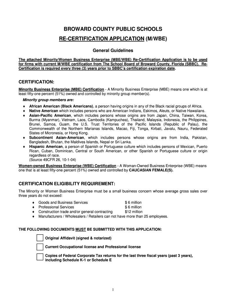 Minority Business Enterprise Women Business Enterprise M/WE RE-CERTIFICATION APPLICATION Supplier Diversity & Outreach Program 7720 W. Oakland Park Boulevard, Suite 323 Sunrise, FL 33351 Tel (754)