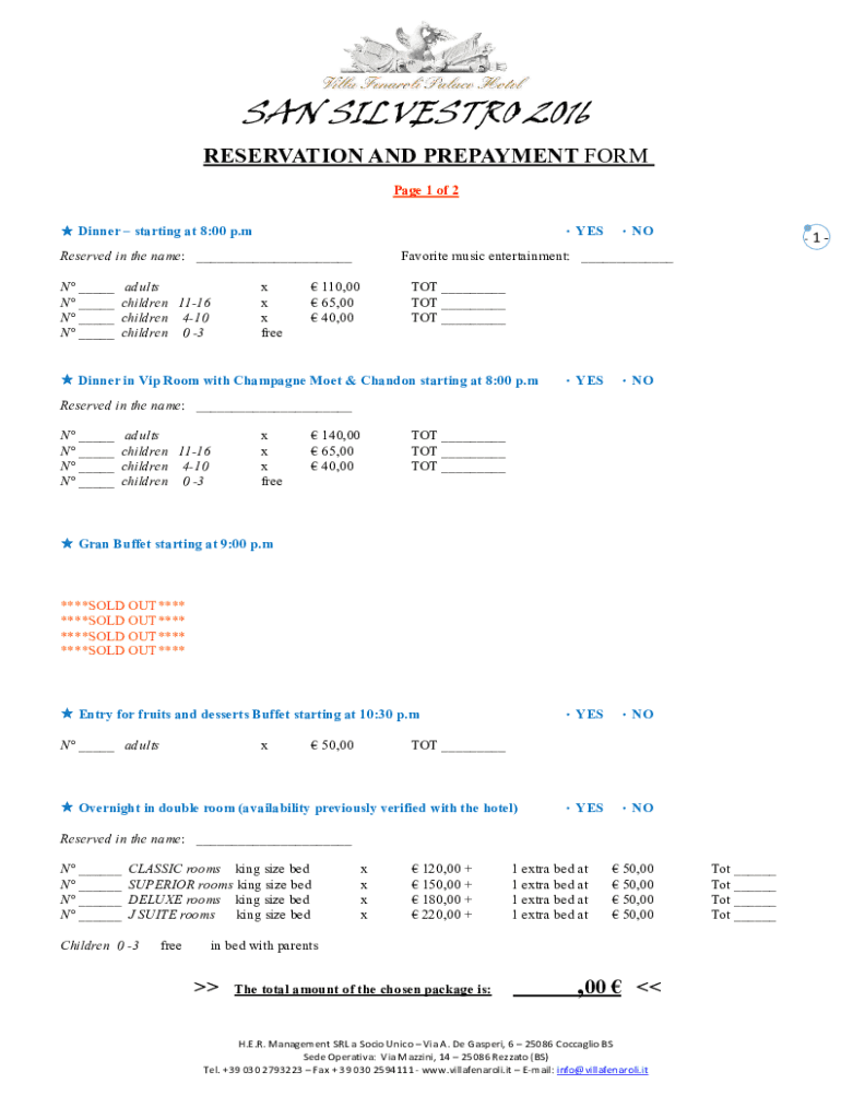 SAN SILVER 2016 RESERVATION AND PREPAYMENT FORM Page 1 of 2 Dinner starting at 8:00 p.m Preserved in the name: N N N N adults children 1116 children 410 children 0 3x × x free Favorite music entertainment: