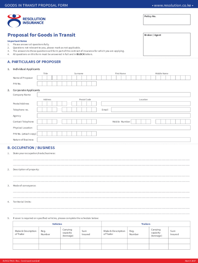 GOODS IN TRANSIT PROPOSAL FORM www.resolution.co.ke Policy No. Proposal for Goods in TransitBroker / AgentImportant Notes 1. Please answer all questions fully. 2. Questions not relevant to you, please