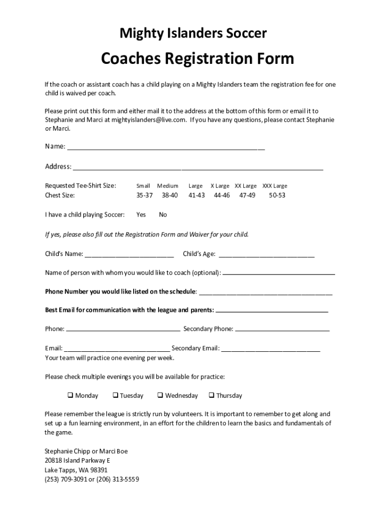 Mighty Islanders SoccerCoaches Registration Form If the coach or assistant coach has a child playing on a Mighty Islanders team the registration fee for one child is waived per coach. Please print
