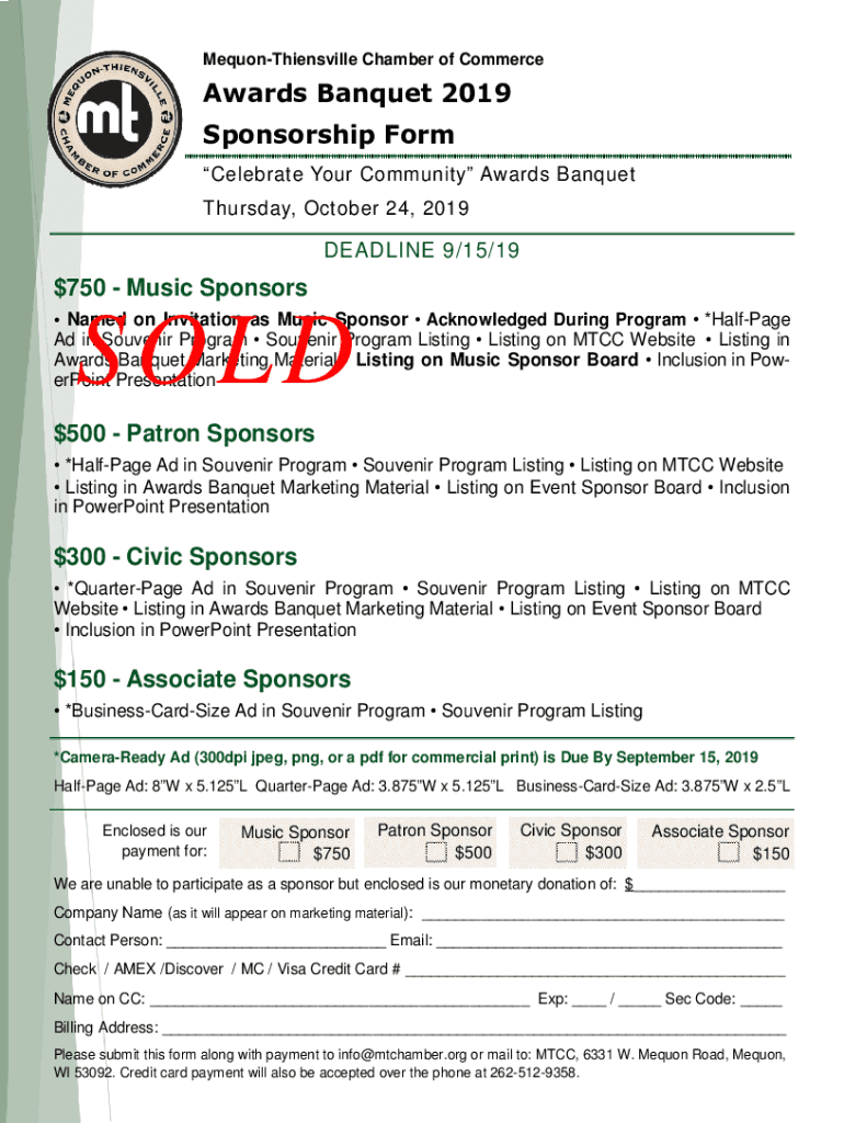 MequonThiensville Chamber of CommerceAwards Banquet 2019 Sponsorship Form Celebrate Your Community Awards Banquet Thursday, October 24, 2019DEADLINE 9/15/$19750 Music Sponsors Named on Invitation