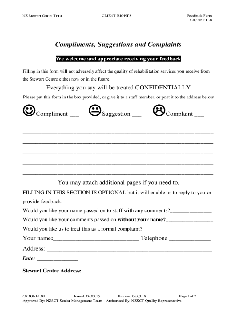 NZ Stewart Center Trustiest RIGHTSFeedback Form CR.006. F1.04Compliments, Suggestions and Complaints We welcome and appreciate receiving your feedback Filling in this form will not adversely affect