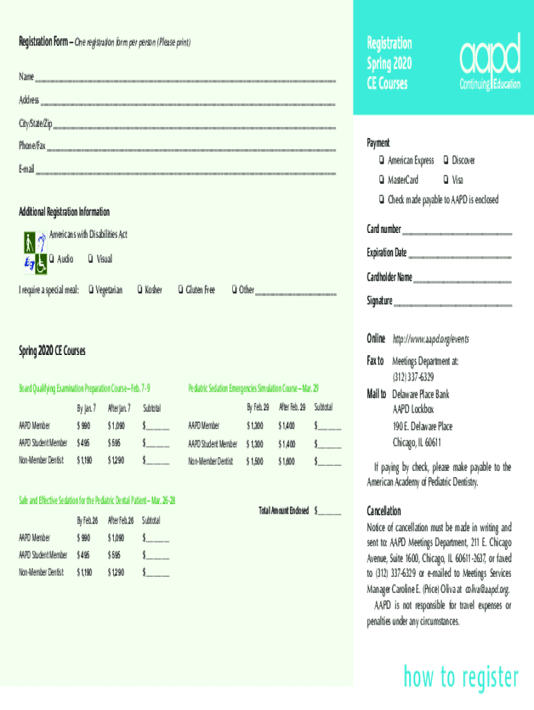 Registration Form One registration form per person (Please print) Name Registration Spring 2020 CE CoursesAddress City/State/Zip Phone/Fax Email Expiration Date o Visual o Vegetarian Kosher Gluten