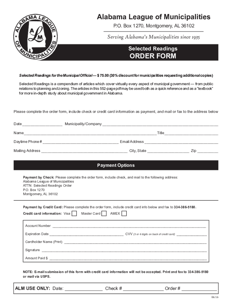 Alabama League of Municipalities P.O. Box 1270, Montgomery, AL 36102Serving Alabama's Municipalities since 1935 Selected ReadingsORDER FORMS elected Readings for the Municipal Official $75.00 (30%