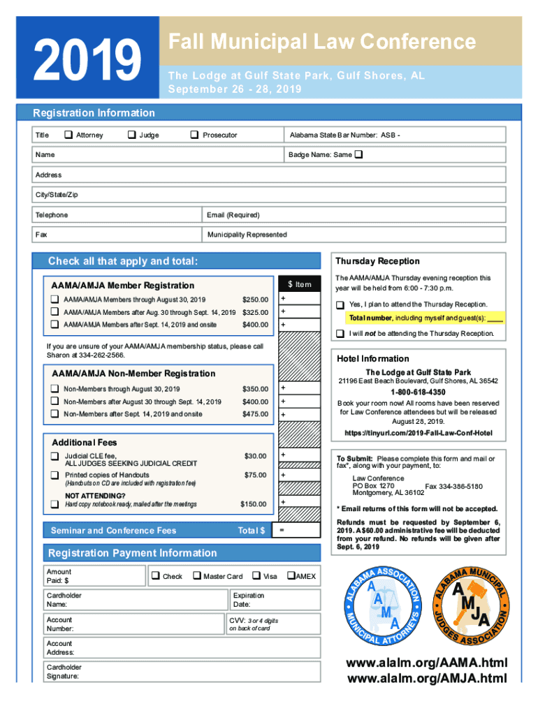 2019Fall Municipal Law Conference The Lodge at Gulf State Park, Gulf Shores, AL Embassy Suites Hotel and2019 Conference Center, Montgomery, AL September 26 28,Registration InformationTitleq AttorneyJudgeProsecutor