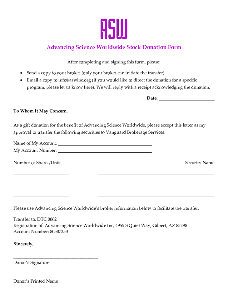 Advancing Science Worldwide Stock Donation Form After completing and signing this form, please: Send a copy to your broker (only your broker can initiate the transfer). Email a copy to info asking.org