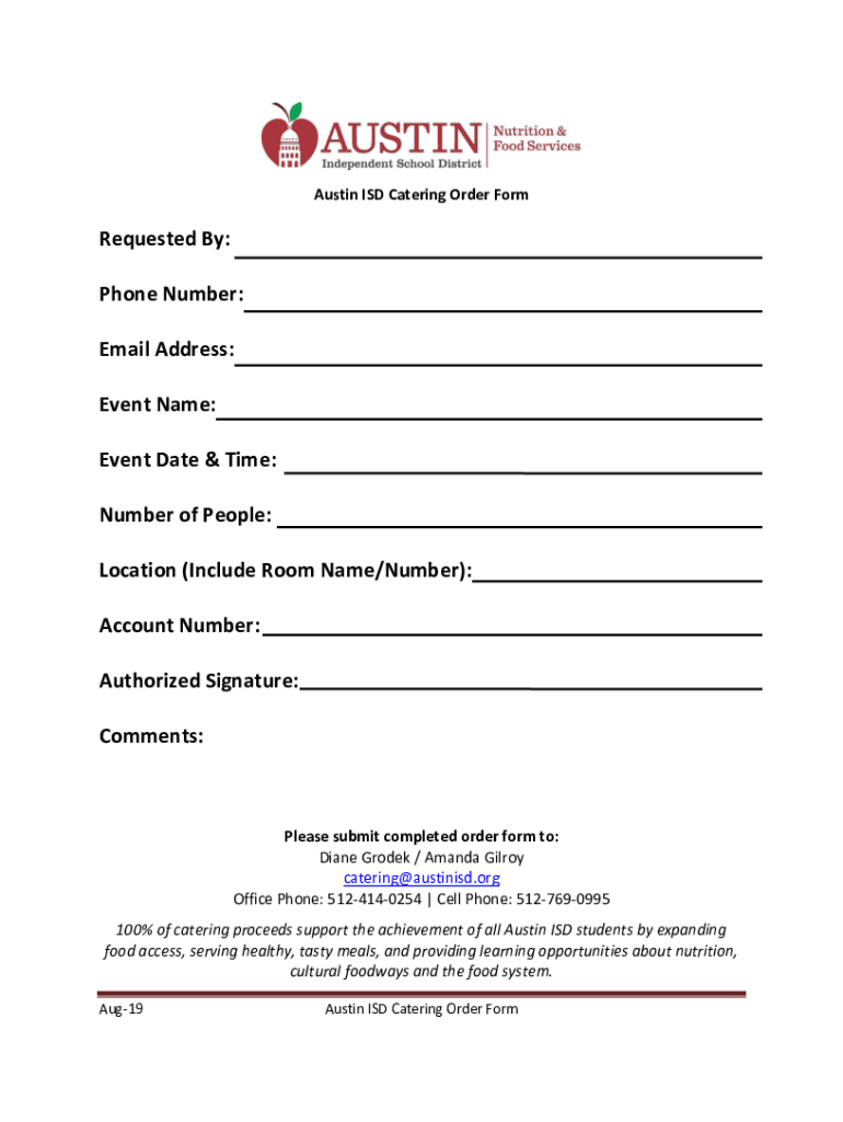Austin ISD Catering Order FormRequested By: Phone Number: Email Address: Event Name: Event Date & Time: Number of People: Location (Include Room Name/Number): Account Number: Authorized Signature: