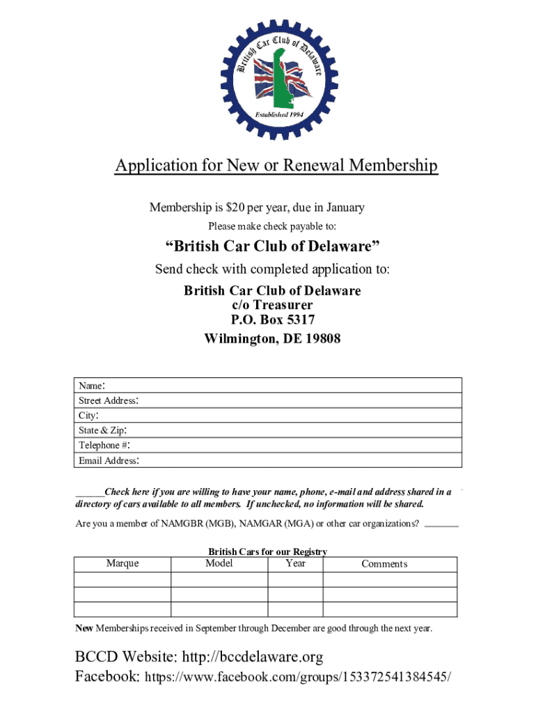 Application for New or Renewal Membership is $20 per year, due in January Please make check payable to:British Car Club of Delaware Send check with completed application to: British Car Club of Delaware