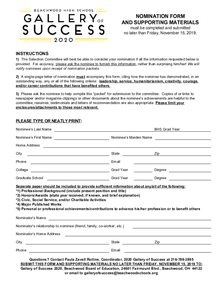 NOMINATION FORM AND SUPPORTING MATERIALS must be completed and submitted no later than Friday, November 15, 2019.INSTRUCTIONS 1) The Selection Committee will best be able to consider your nomination