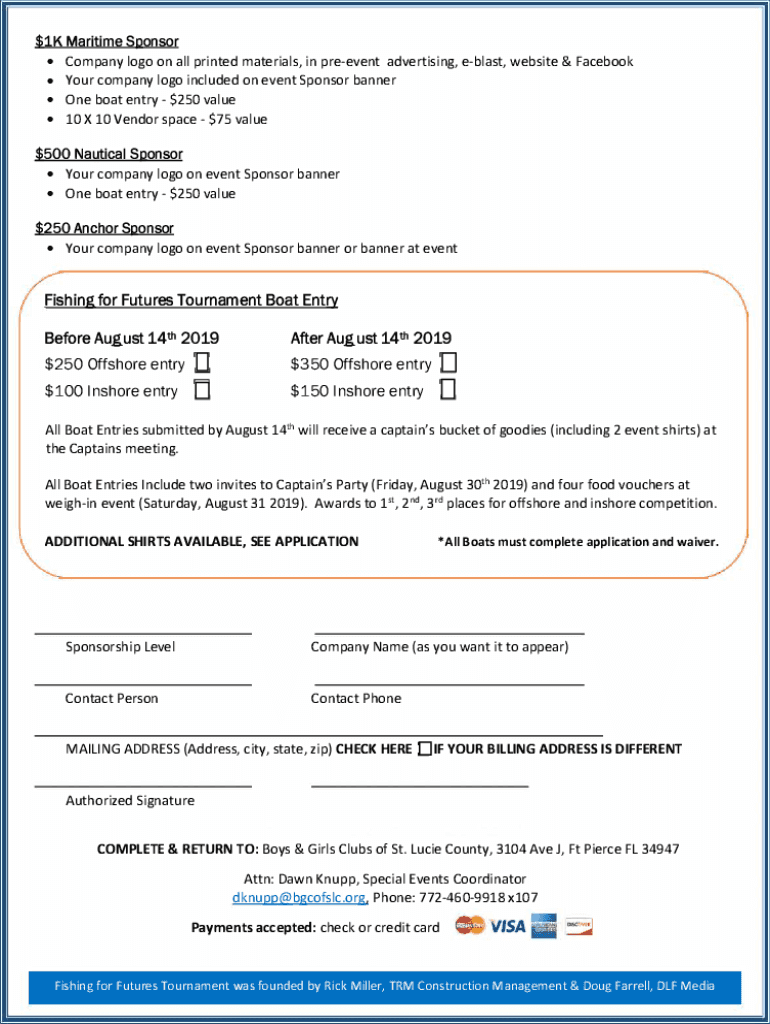 2019 Fishing for Futures Tournament August 31, 2019, I Manatee Center, Fort PierceSponsorship OpportunitiesYour Company will be front and center at this family friendly free event at the Manatee Center,
