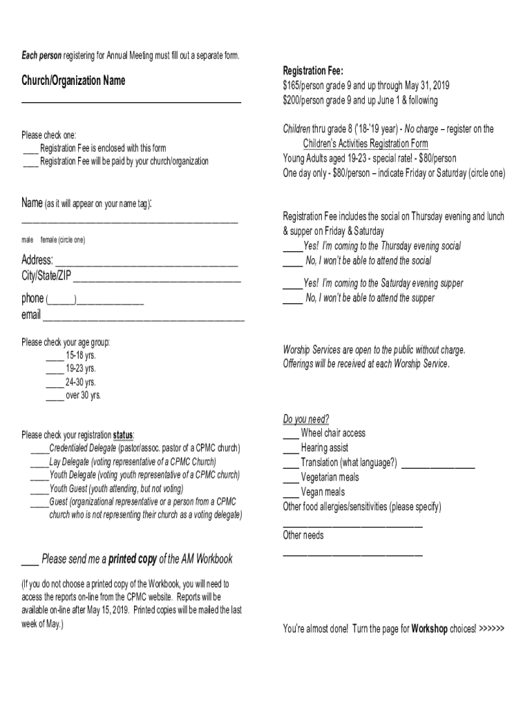 Each person registering for Annual Meeting must fill out a separate form. Church/Organization Name Registration Fee: $165/person grade 9 and up through May 31, $2019200/person grade 9 and up June