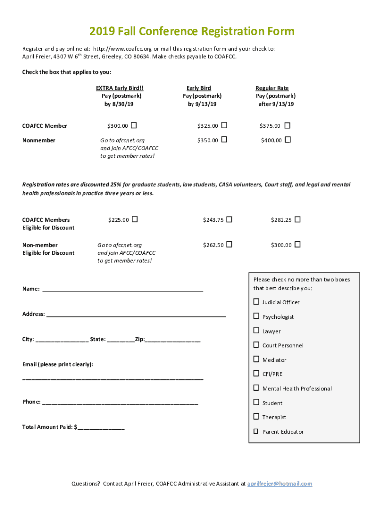 Register and pay online at: http://www.coafcc.org or mail this registration form and your check to: