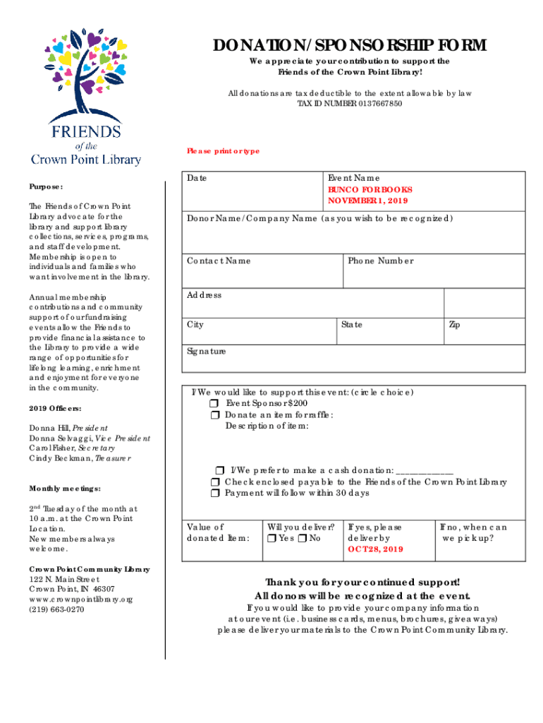Friends of the Crown Point Library! All donations are tax-deductible to the extent allowable by law
