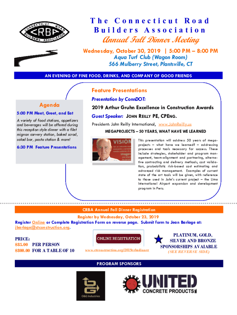 The Connecticut Road Builders AssociationAnnual Fall Dinner Meeting Wednesday, October 30, 2019 5:00 PM 8:00 PM Aqua Turf Club (Wagon Room) 566 Mulberry Street, Grantsville, CT AN EVENING OF FINE