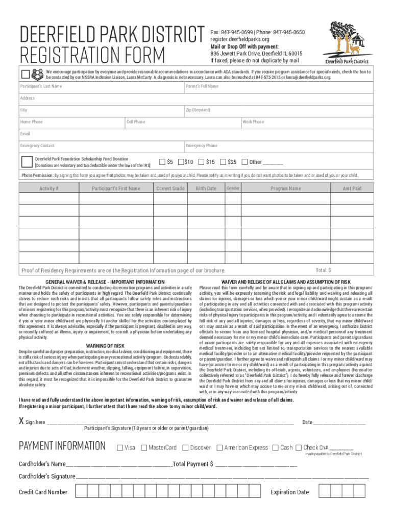 - Submit the form online or visit the Deerfield Park District office to submit in person