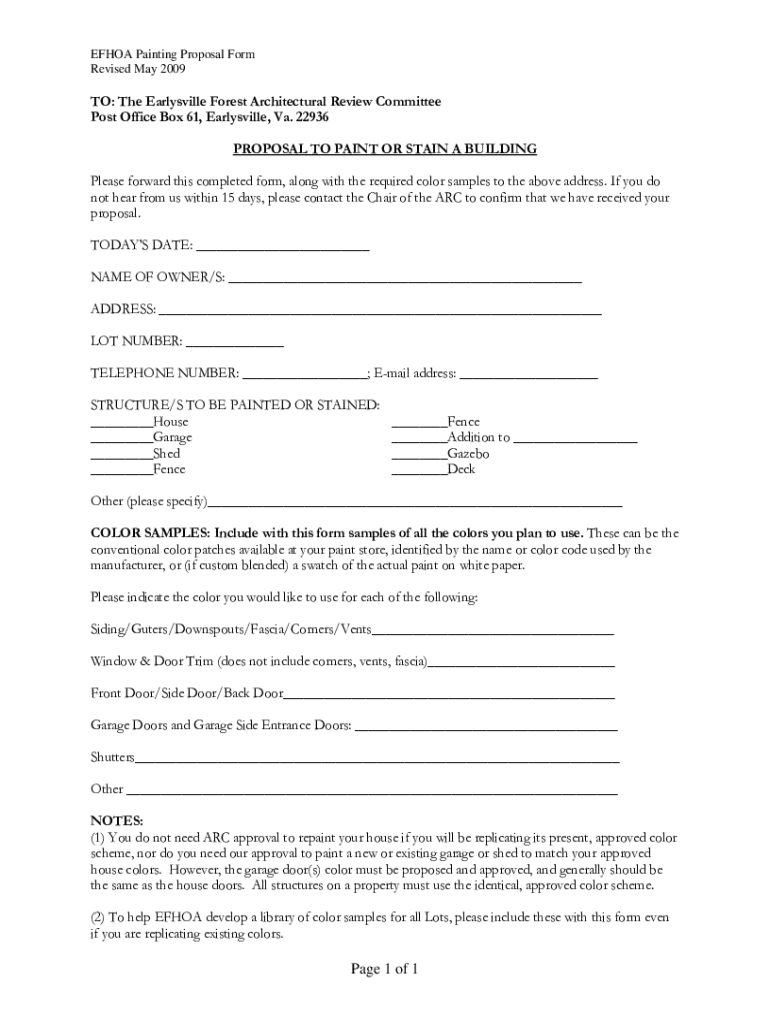 EF HOA Painting Proposal Form Revised May 2009TO: The Marysville Forest Architectural Review Committee Post Office Box 61, Marysville, Va. 22936 PROPOSAL TO PAINT OR STAIN A BUILDING Please forward