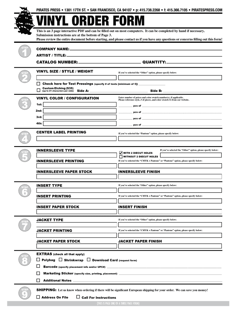The Vinyl Order Form is a purchase order template used by companies and artists to place orders for customized vinyl records.