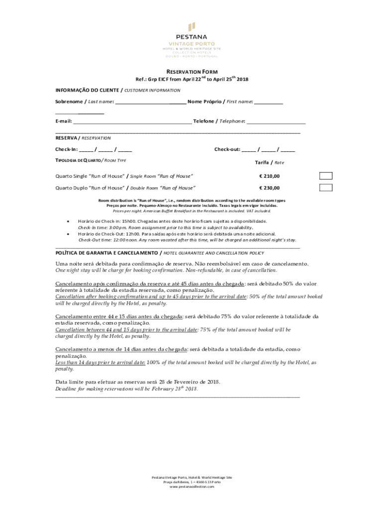 RESERVATION Formed TH Ref.: GRP EIC from April 22to April 252018INFORMAO DO CLIENT / CUSTOMER INFORMATIONSobrenome / Last name: Nome PPRI / First name: Email:Telephone / Telephone: RESERVE / RESERVATIONCheckIn: