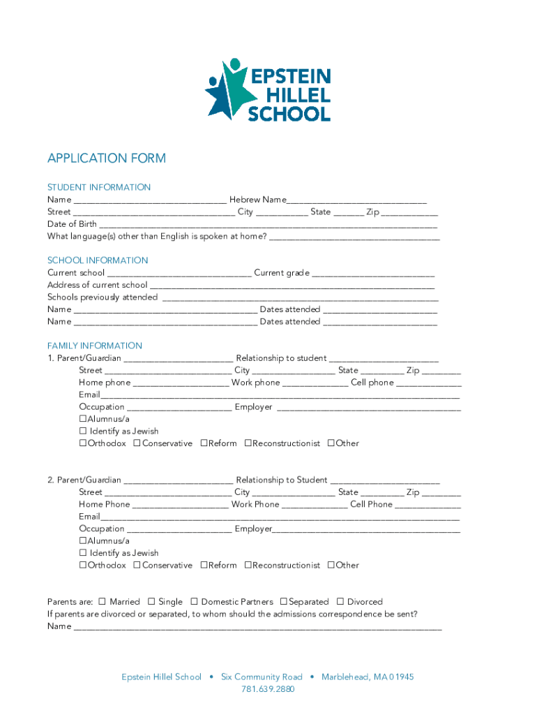 APPLICATION FORM STUDENT INFORMATION Name Hebrew Name Street City State Zip Date of Birth What language(s) other than English is spoken at home? SCHOOL INFORMATION Current school Current grade Address