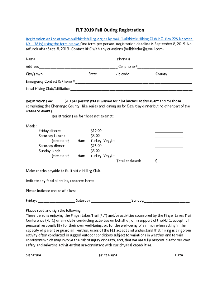 FLT 2019 Fall Outing Registration online at www.bullthistlehiking.org or by mail (Bull thistle Hiking Club P.O. Box 225 Norwich, NY 13815) using the form below. One form per person. Registration deadline