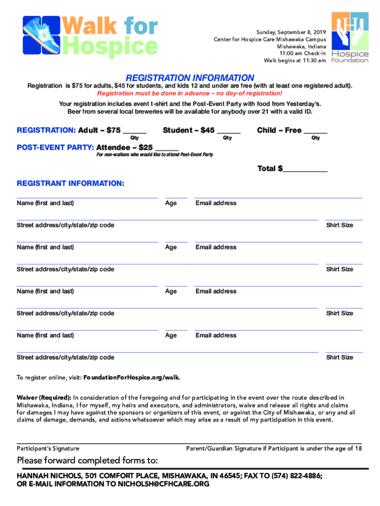 Walk for Hospice Sunday, September 8, 2019, Center for Hospice Care Mishawaka Campus Mishawaka, Indiana 11:00 am Checking Walk begins at 11:30 registration INFORMATIONRegistration is $75 for adults,
