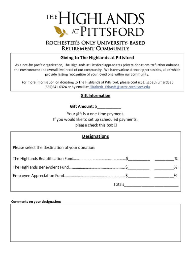 As a not for profit organization, The Highlands at Pitts ford appreciates private donations to further enhance