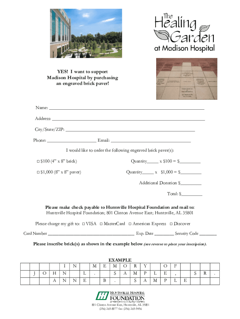YES! I want to support Madison Hospital by purchasing an engraved brick paver! Name: Address: City/State/ZIP: Phone: Email: I would like to order the following engraved brick paver(s): $100 (4 ×