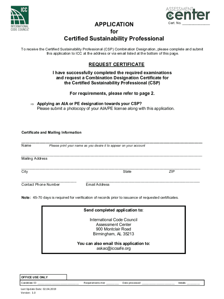 APPLICATION for Certified Sustainability ProfessionalCert. No. To receive the Certified Sustainability Professional (CSP) Combination Designation, please complete and submit this application to ICC