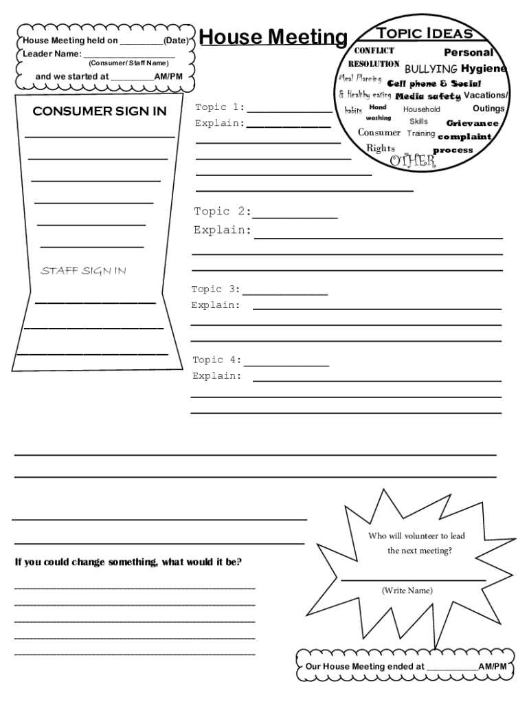House Meeting held on (Date) Leader Name: House MeetingConflict Resolution(Consumer/ Staff Name)and we started at AM/CONSUMER SIGN IN STAFF SIGN IN Topic Ideas Personal BULLYING HygieneMeal Planning