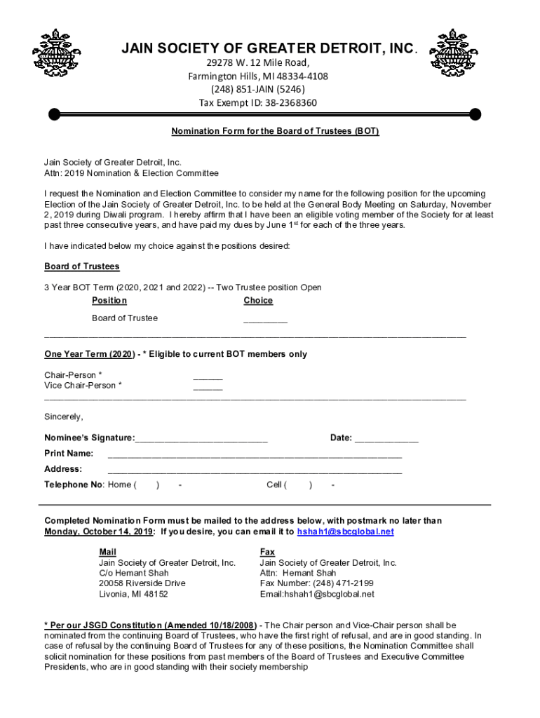 JAIN SOCIETY OF GREATER DETROIT, INC. 29278 W. 12 Mile Road, Farmington Hills, MI 483344108 (248) 851JAIN (5246) Tax Exempt ID: 382368360Nomination Form for the Board of Trustees (BOT) Jain Society