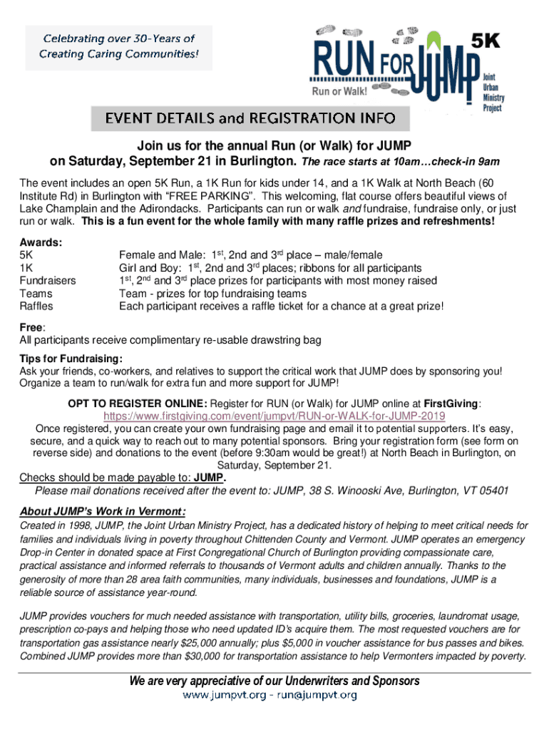 on Saturday, September 21 in Burlington. The race starts at 10amcheckin 9am