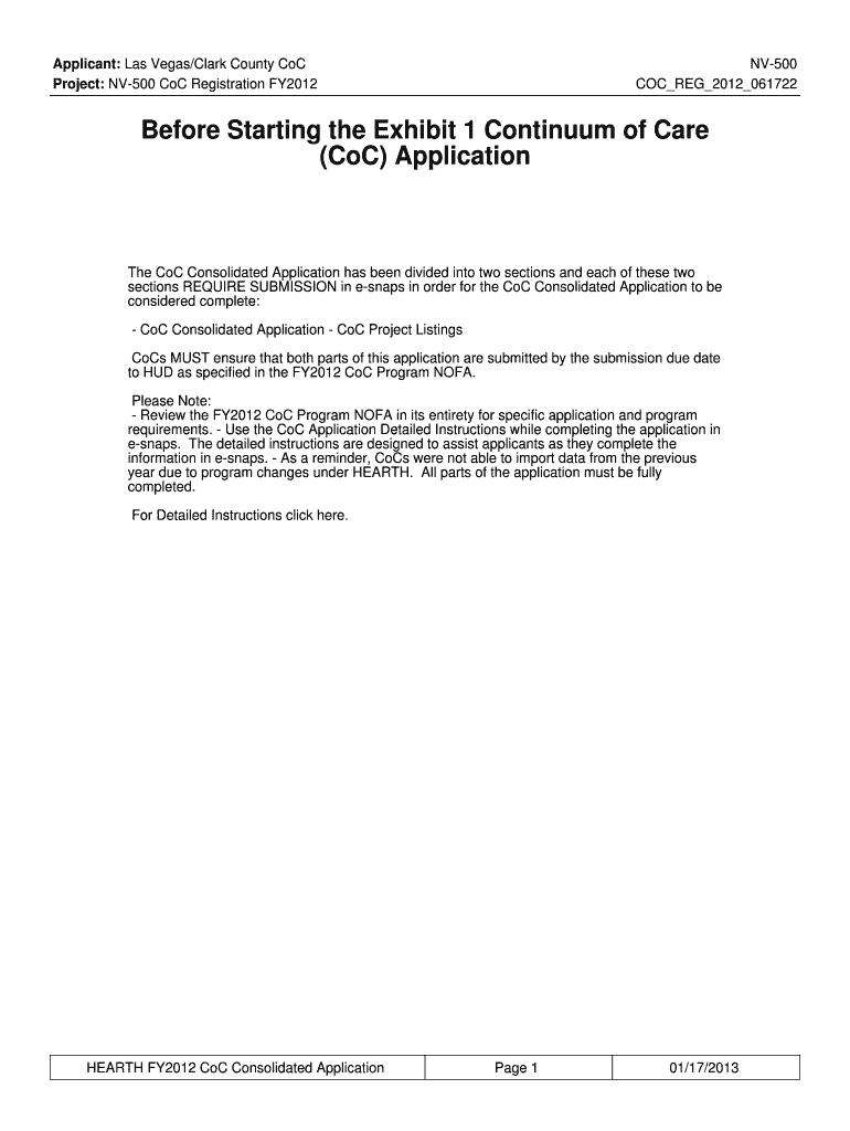 Applicant: Las Vegas/Clark County COC Project: NV-500 COC Registration FY2012 NV-500 COC REG 2012 061722 Before Starting the Exhibit 1 Continuum of Care (COC) Application The COC Consolidated Application