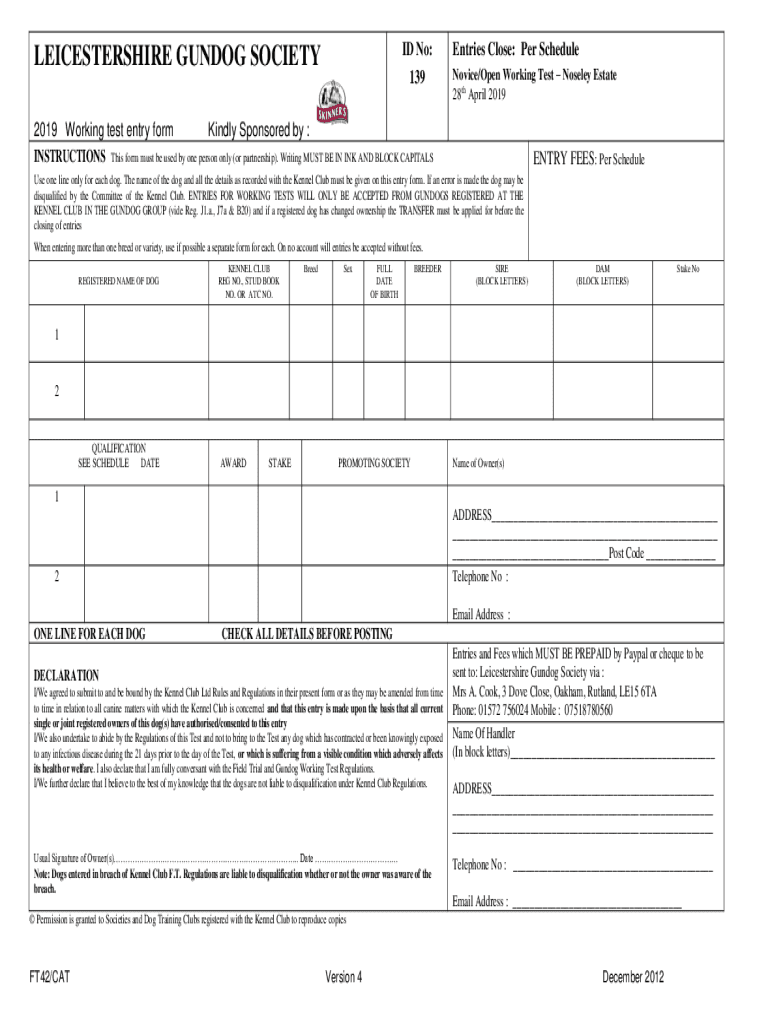 ID No: 139LEICESTERSHIRE GUIDO SOCIETY 2019 Working test entry form INSTRUCTIONSEntries Close: Per Schedule Novice/Open Working Test Moseley Estate 28th April 2019Kindly Sponsored by : ENTRY FEES: