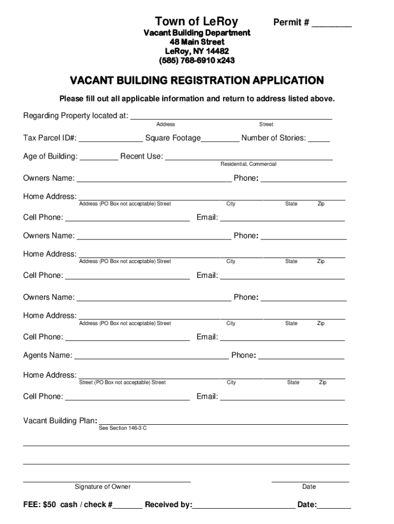 Town of LeRoyPermit # Vacant Building Department 48 Main Street Leroy, NY 14482 (585) 7686910 x243VACANT BUILDING REGISTRATION APPLICATION Please fill out all applicable information and return to