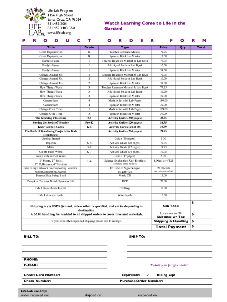 Life Lab Program 1156 High Street Santa Cruz, CA 95064 831.459.2001 831.459.3483 FAX www.lifelab.orgPRODUCWatch Learning To come to Life in the Garden! TORDERFTitle Great Explorations Earth is Homemade