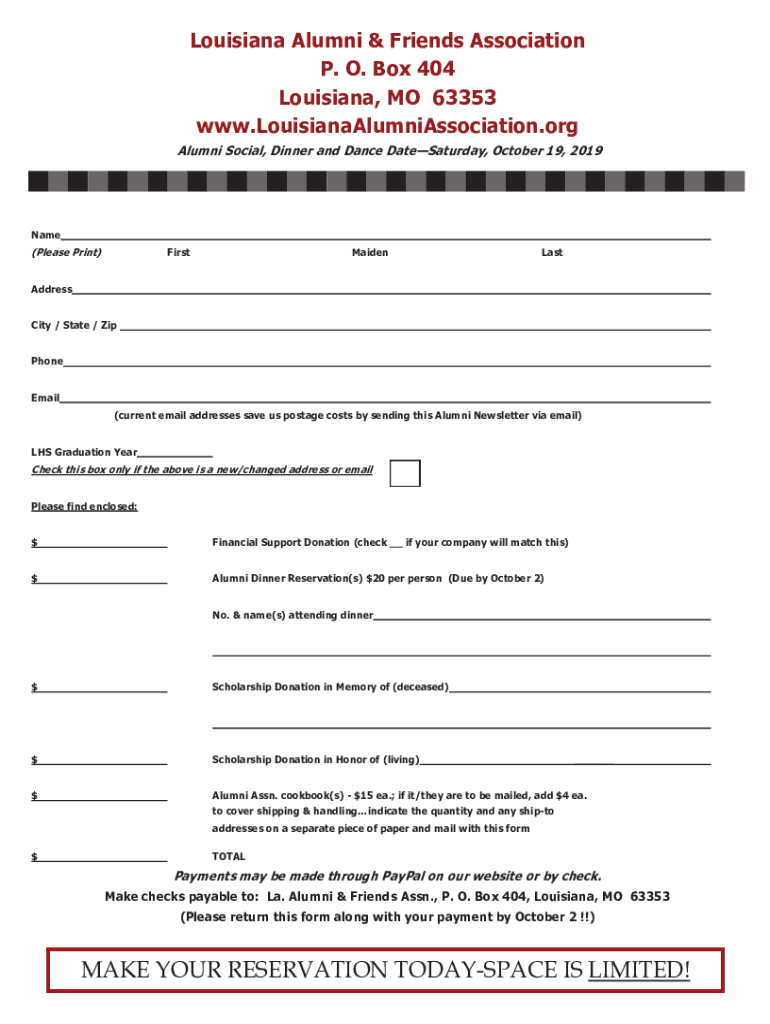 Louisiana Alumni & Friends Association P. O. Box 404 Louisiana, MO 63353 www.LouisianaAlumniAssociation.org Alumni Social, Dinner and Dance Date Saturday, October 19, 2019Name(Please Print)FirstMaidenLastAddress