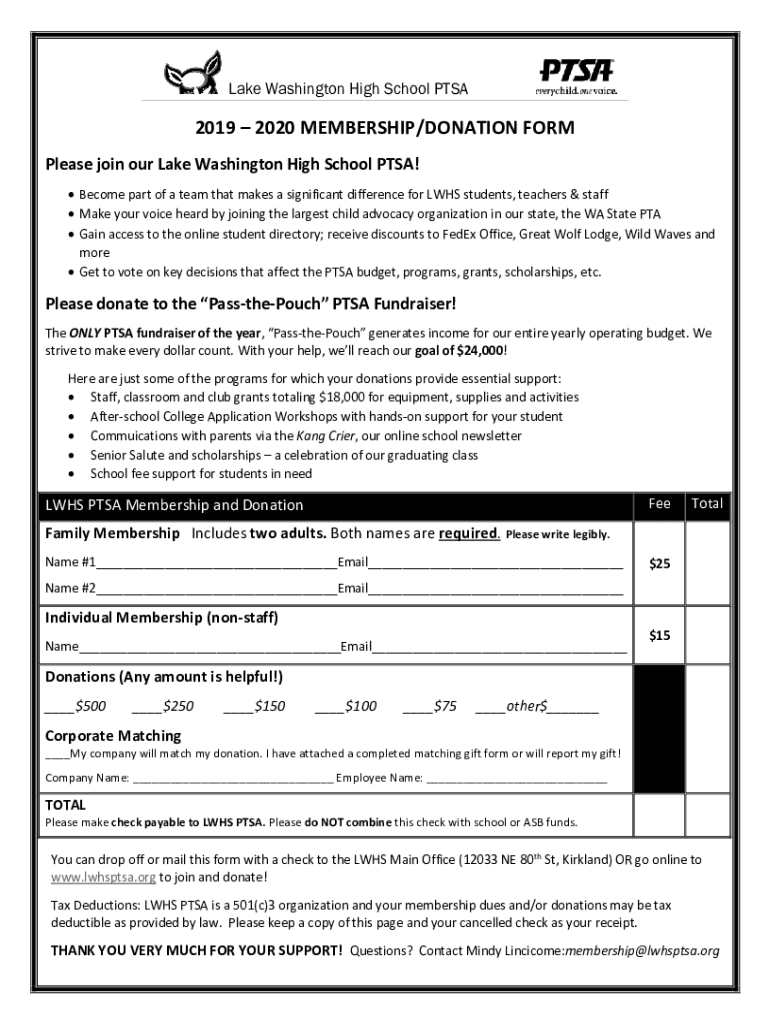 Lake Washington High School PTSA2019 2020 MEMBERSHIP/DONATION FORM Please join our Lake Washington High School PSA! Become part of a team that makes a significant difference for LHS students, teachers