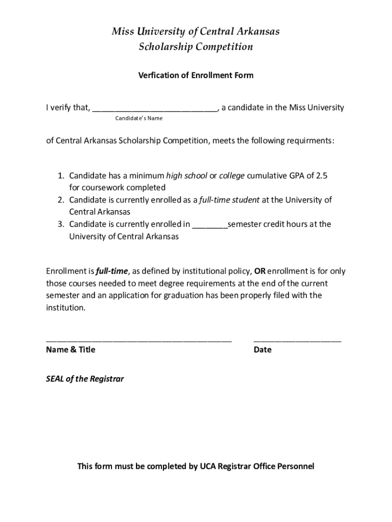 Miss University of Central Arkansas Scholarship Competition Verification of Enrollment Form verify that, a candidate in the Miss University Candidates Name of Central Arkansas Scholarship Competition,