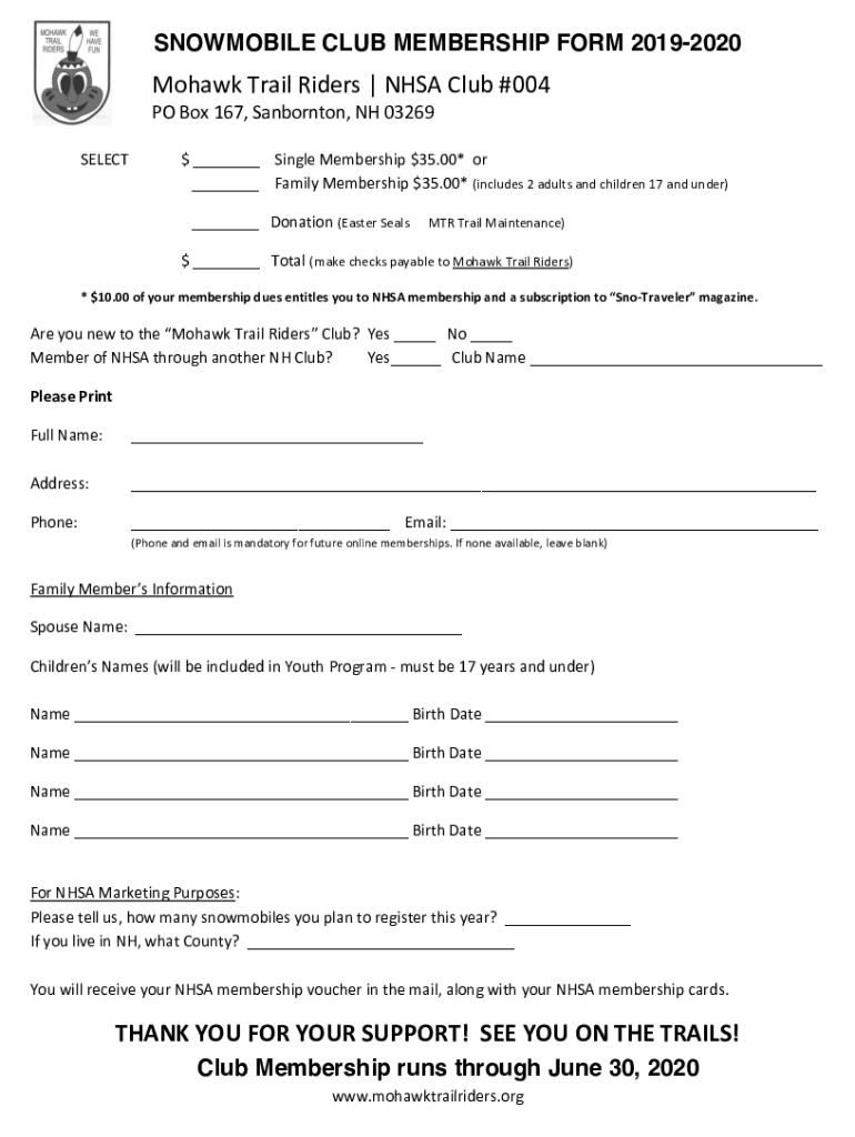 SNOWMOBILE CLUB MEMBERSHIP MEMBERSHIPFORM FORM20182019 20192020Mohawk Trail Riders NASA Club #004 PO Box 167, Sanbornton, NH 03269 SELECT Single Membership $35.00* or Family Membership $35.00* (includes