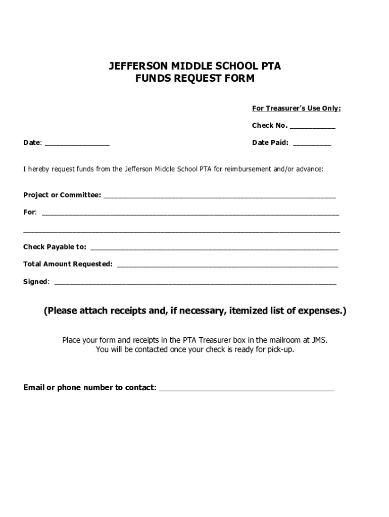 JEFFERSON MIDDLE SCHOOL PTA FUNDS REQUEST FORM For Treasurer's Use Only: Check No. Date: Date Paid: I hereby request funds from the Jefferson Middle School PTA for reimbursement and/or advance: Project