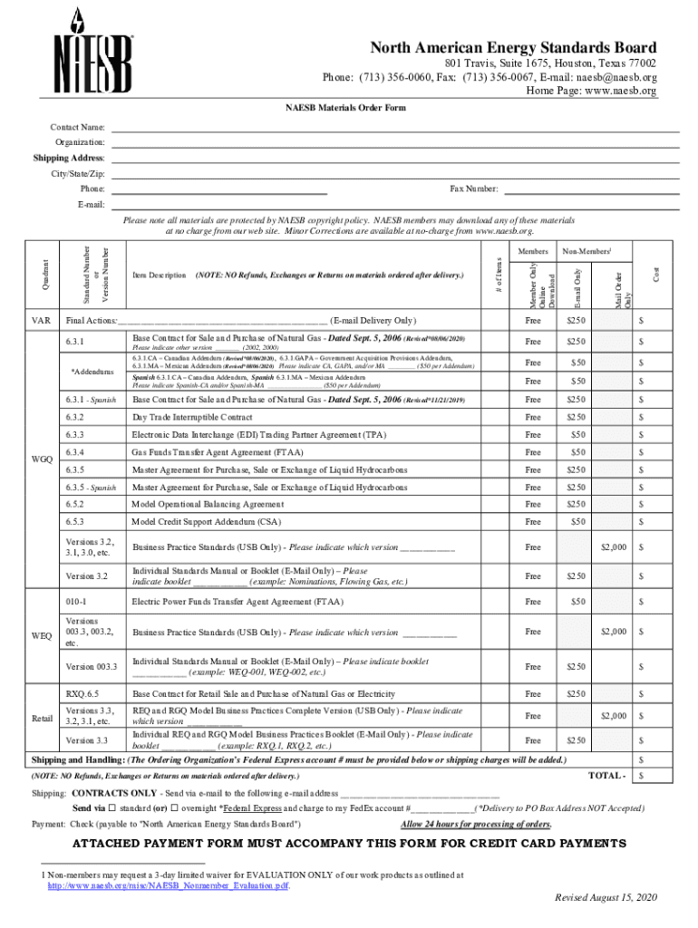 North American Energy Standards Board 801 Travis, Suite 1675, Houston, Texas 77002 Phone: (713) 3560060, Fax: (713) 3560067, Email: names.org Home Page: www.naesb.org NAE SB Materials Order Form Contact