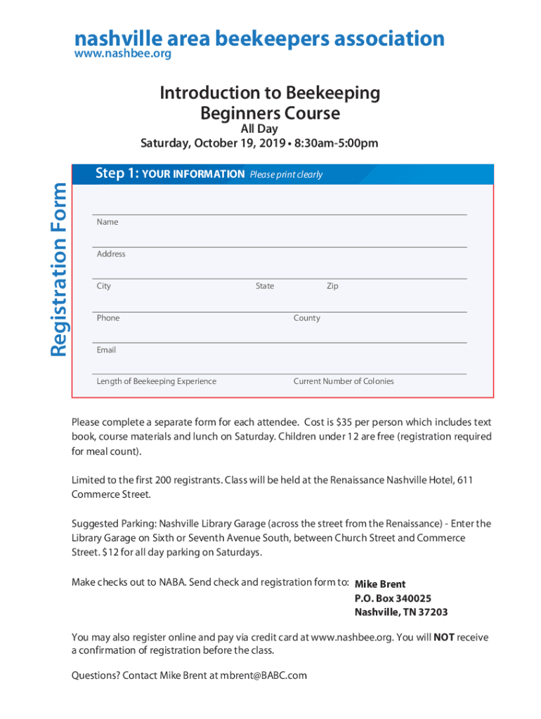 Nashville's area beekeepers association www.nashbee.orgIntroduction to Beekeeping Beginners CourseRegistration Formal Day Saturday, October 19, 2019 8:30am5:00pmStep 1: YOUR INFORMATIONPlease print